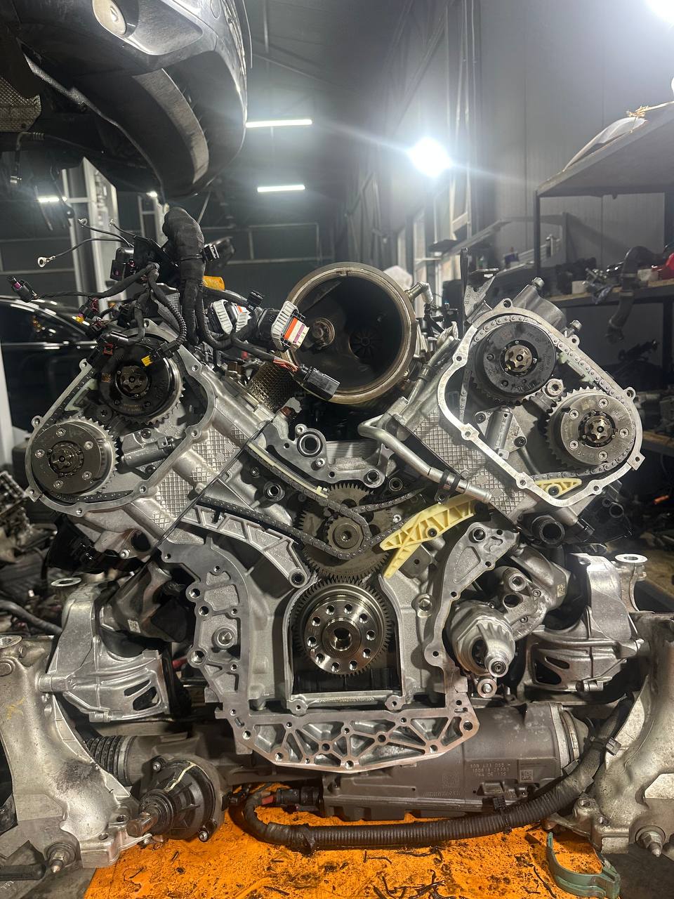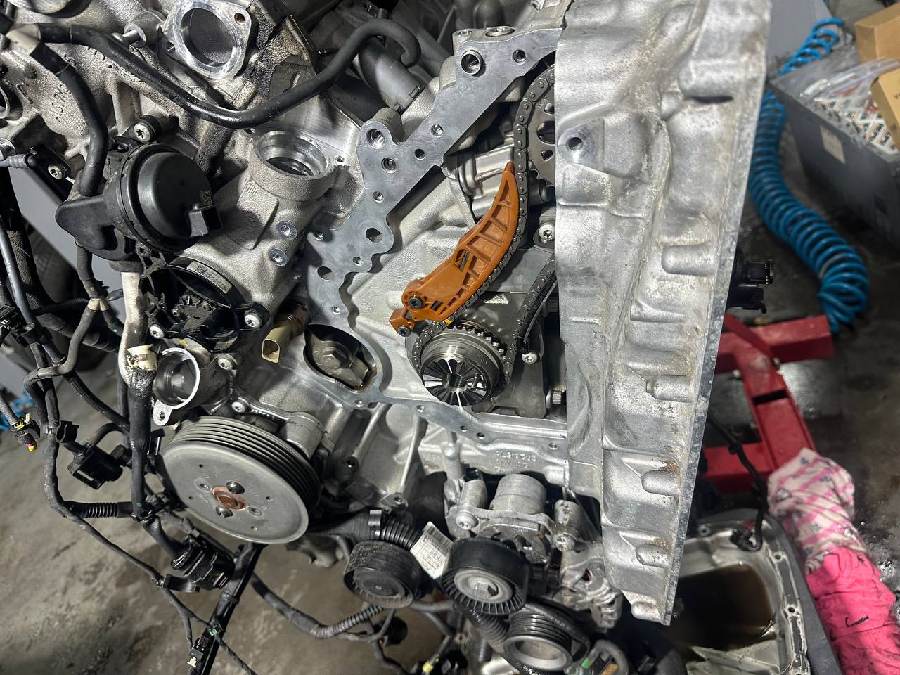 В двигателях EA839 цепной привод ГРМ расположен со стороны коробки. Поэтому для полноценного доступа к внутренним узлам двигатель необходимо полностью снимать.
