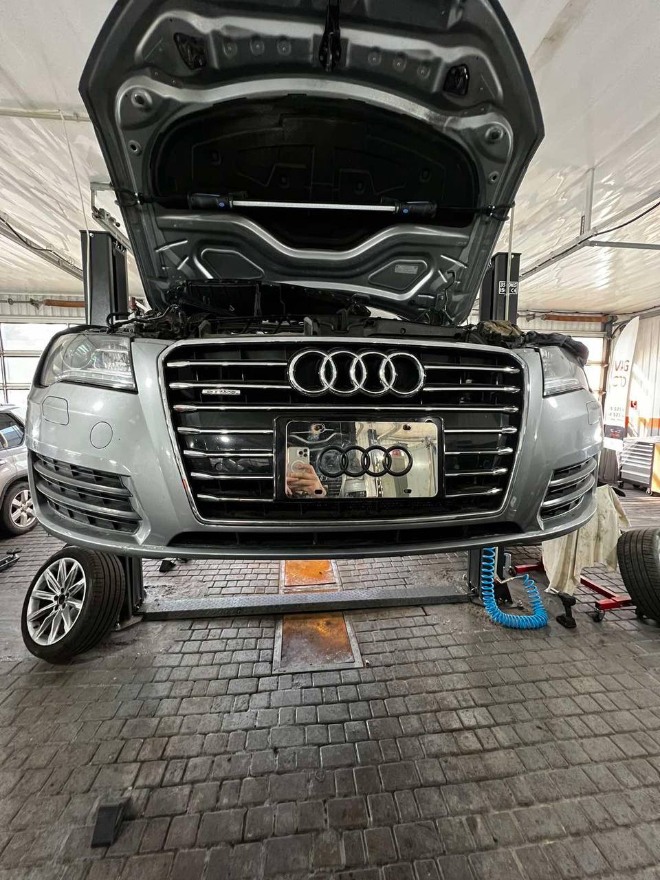 Это достаточно сложная и ответственная работа, на которую больше всего времени тратится именно на подборе всех комплектующих. Прежде, чем мы приступили к работе, мастер изучил всю техническую документацию, подобрали всю необходимую проводку, которую нужно подводить к новым фарам, подобрали блоки, нашли клиенту новые фары и принялись за установку. Для начала демонтировали передний бампер, доставили еще несколько блоков по освещению, проработали электричество, установили новые фары.