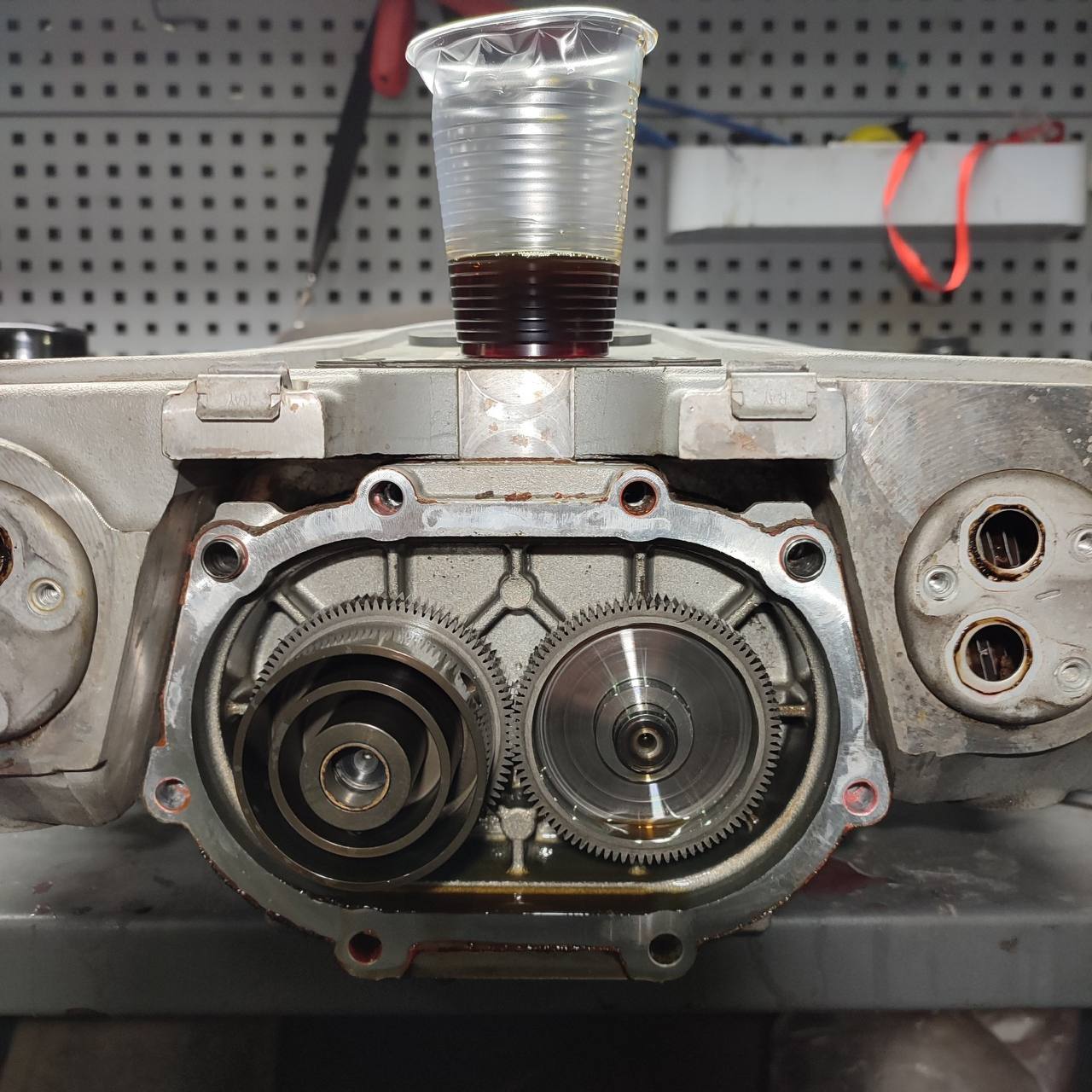 Сначала слили масло, оно было достаточно изношенного качества, на фото можно увидеть, что оно сильно темное, а новое масло гораздо светлее и свежее. Дальше заменили масло, установили обратно компрессор. После запуска он начал работать гораздо мягче, и проблема шума исчезла.