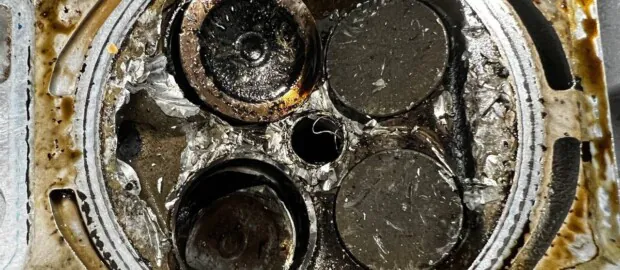 Зробивши еноскопію двигуна, ми побачили, що в поршні отвори. Автомобіль був куплений з Америки нашим клієнтом. Виконавши дефектовку двигуна, ми побачили таку картину, що ножка клапана відірвалася розбила циліндр і побила ще деякі циліндри у двигуні.
